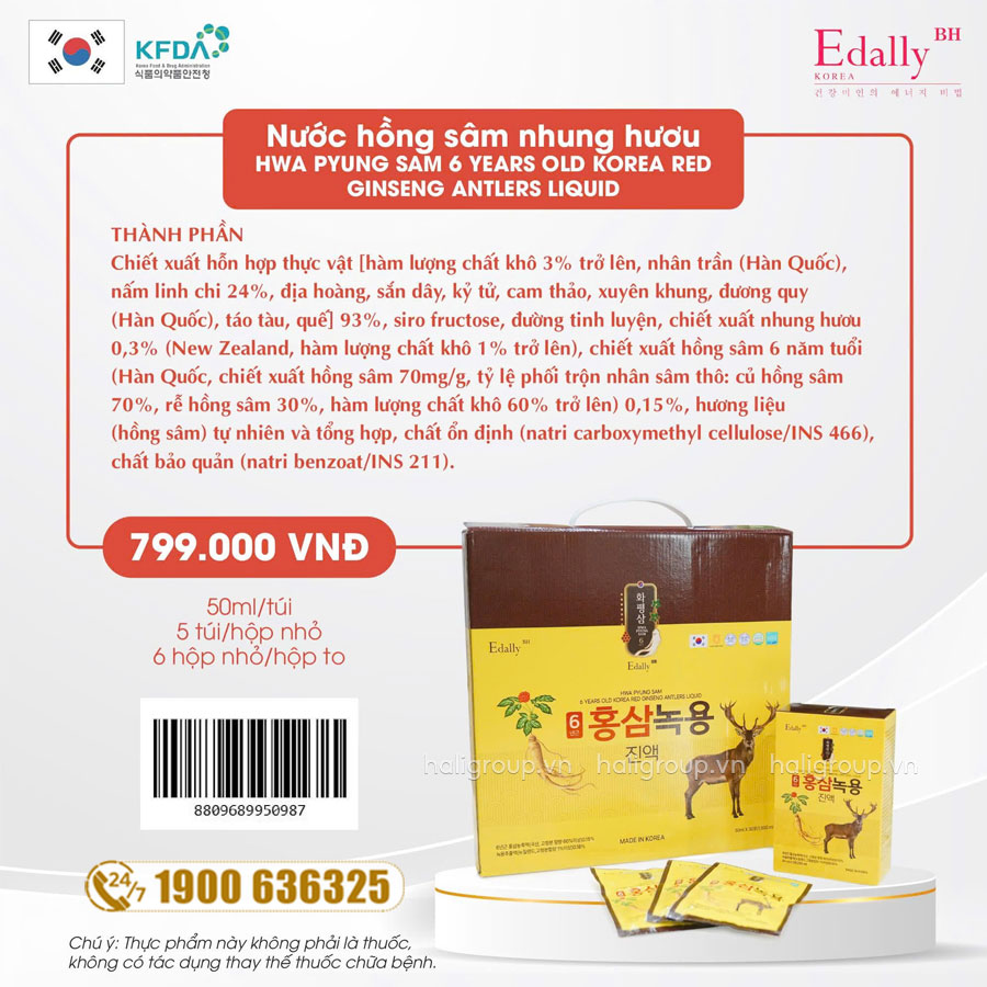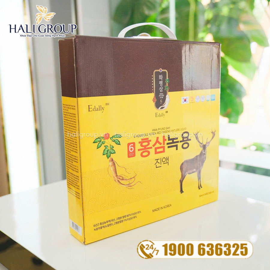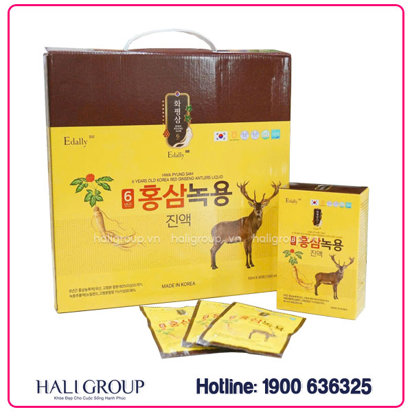 » Nước Hồng Sâm Nhung Hươu Edally Hwa Pyung Sam 6 Year Old Korea Red Ginseng Antlers Liquid chính hãng có giá niêm yết trên toàn quốc là 799.000đ/1 Hộp 30 gói x 50ml.